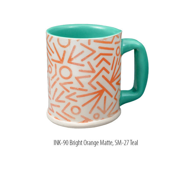 INK-90 Bright Orange Matte Ink is a tangerine color that is neon at cone 05, darkens slightly at cone 5 and becomes a deep pumpkin at cone 10. A clear glaze accentuates the final, fired color.