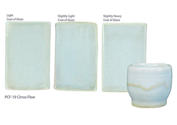 A glossy pale blue glaze like a delicate cloud. Breaks across textured surfaces and develops a peachy float when thick. Great for layering with other glazes as a base or top coat. Beautiful on any color of clay. Good at cone 5, more fluid at cone 6.