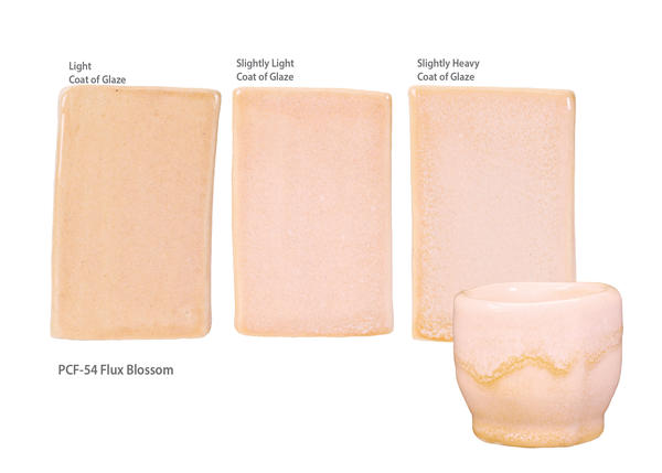 PCF-54 Flux Blossom is glossy pale pink glaze like a fresh flower. It breaks across textured surfaces and develops a nice peachy float when thick. Great for layering with other glazes as a base or top coat.