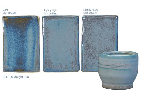 PCF-3 Midnight Run is a glossy dark blue-gray glaze like a velvety night sky. Breaks dark across textured surfaces. Great for layering with other glazes as a base or top coat. Beautiful on any color of clay. Good at cone 5, more fluid at cone 6.