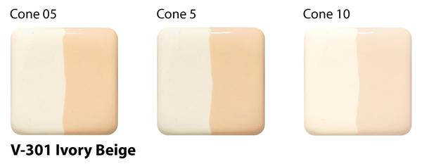 Ivory Beige Velvet Underglaze is a soft cream color that is very light at cone 05. It warms up a little at cone 5, but burns out almost completely at cone 10. A clear glaze over Ivory Beige accentuates and darkens the color at cone 05 and cone 5. At cone 10, there is no color change between glazed and unglazed.