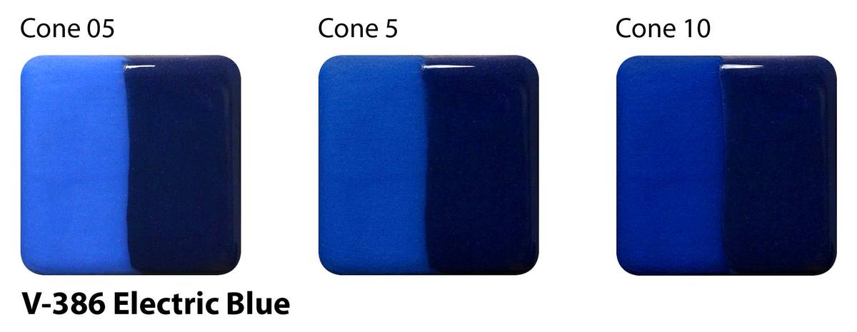 Electric Blue Velvet Underglaze is a very deep cobalt blue that is vivid at cone 05, darkens significantly at cone 5, and becomes a very dark navy blue at cone 10. A clear glaze deepens the color of the underglaze significantly at any temperature.