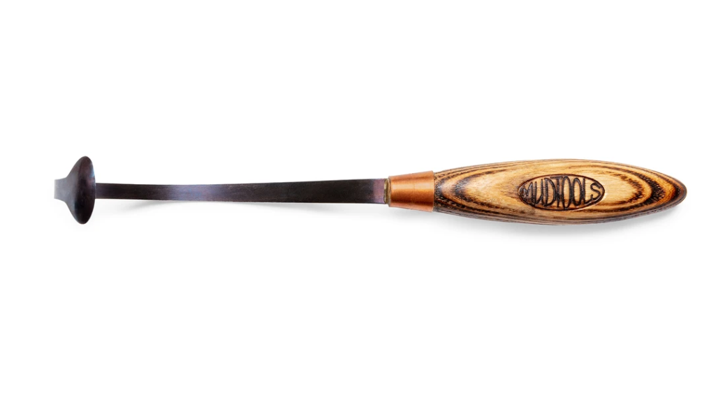 Michael’s take on a chatter tool. Part of the new Signature Series these tools are a work of craftsmanship; made of carbon steel, copper and found local hardwood. The sharpened spade allows you to cut into the clay providing crisp texture. The unique neck it specially tempered to provide optimal flexibility and allow the blade to bounce back. The Thumper comes in two sizes: small, best for your average cups and bowl & wide for those of you who like to throw bigger.