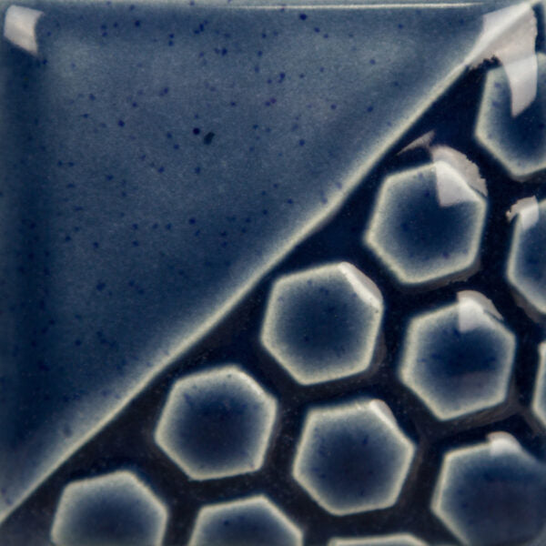 Cone 06 oxidation (large photo): Denim blue is a glossy, blueish gray glaze with the look of denim that has fine dark blue specks. Semi-Transparent at 2 – 3 coats..