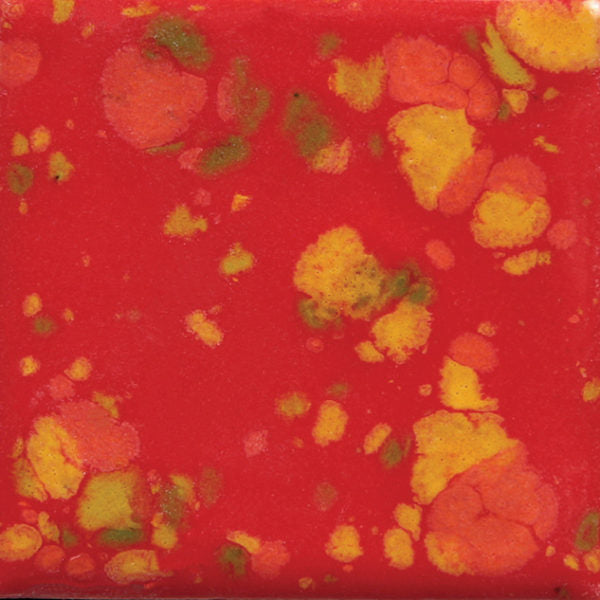 Cone 06 oxidation (large photo): Firecracker is an opaque red base glaze with orange, green, and yellow crystals.