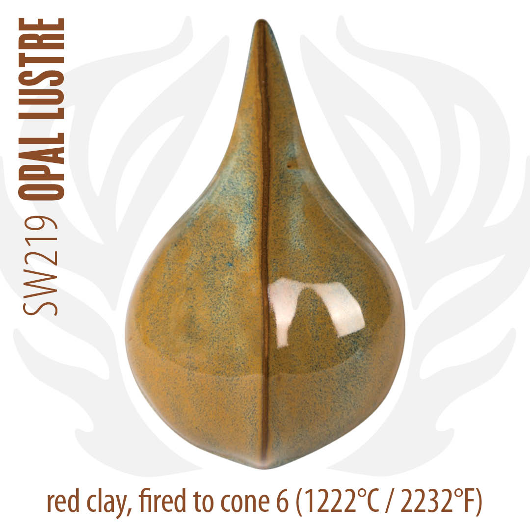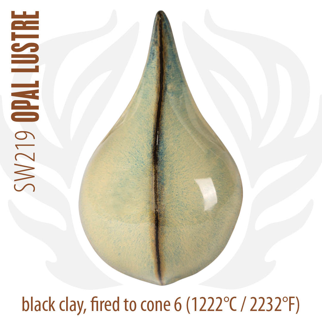 Cone 6 oxidation (larger image): Opal Lustre is a glossy, semi-opaque glaze that displays variegated shades of blues, greens, and purples. Breaks warm brown over texture.