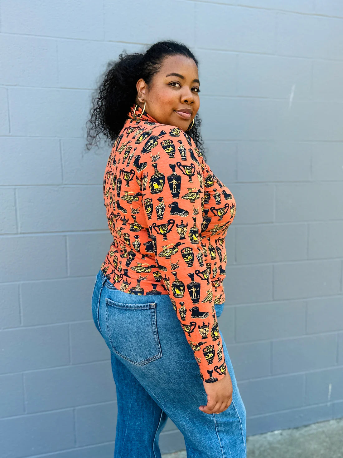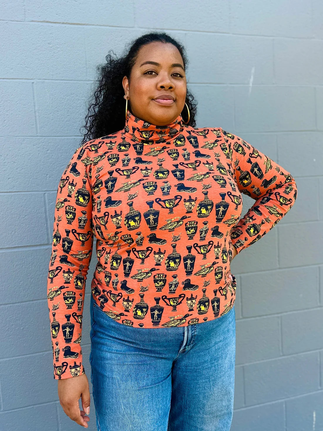 A quintessential layering staple for chilly weather, but more fun! Made in soft and stretchy cotton jersey, this top features a classic fold over turtleneck neckline, long sleeves, hits below the waist, and is single layered.